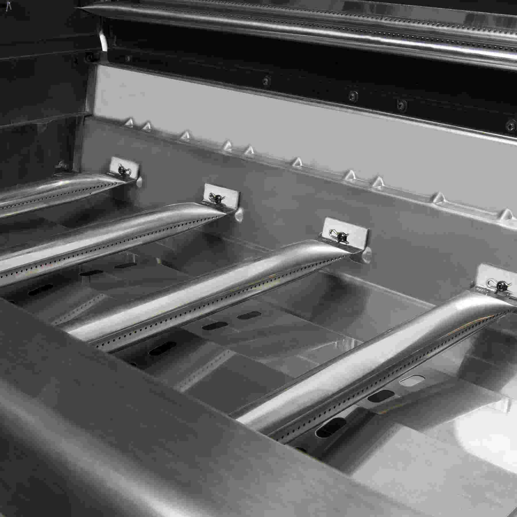 5 Dual Tube Edelstahl Stabbrenner 16,0 kW, Infrarot Seitenbrenner 2,9 kW, Spießbratenbrenner 4,4 kW, 5-tlg. Flav-R-Cast Edelstahlgussroste, Grillfläche 80 x 48,5 cm, integrierte Grillflächenbeleuchtung, Edelstahl Ablagerost 77 x 21 cm, Edelstahl Flav-R-Wave Verdampfungssystem, Linear Flow Gasdüsen mit 180° Sensi-Touch Steuerung, Deluxe Accu-temp Thermometer, Sure Lite Elektrozündung,auch am Spießbratenbrenner, Doppelwandiger schwarz-emaillierter Deckel mit Aluminiumguss Seitenteilen, Edelstahl-Untergehäuse mit Aluminiumguss Seitenteilen, Edelstahl Deckelgriff, Edelstahl Bedienteil inkl. Kontrollknopf-Beleuchtung, Edelstahl Seitenablagen mit Zubehörhaken und Frontablagen, Cabinetunterwagen mit Gasflaschenintegration für 11 kg Gasflasche, 1 Türe und 2 integrierte Schubladen mit Edelstahl Griffen, 4 feststellbare Lenkrollen, 2 davon höhenverstellbar; Inkl. Drehspießset und Elektromotor, Inkl. Schlauch und Druckminderer