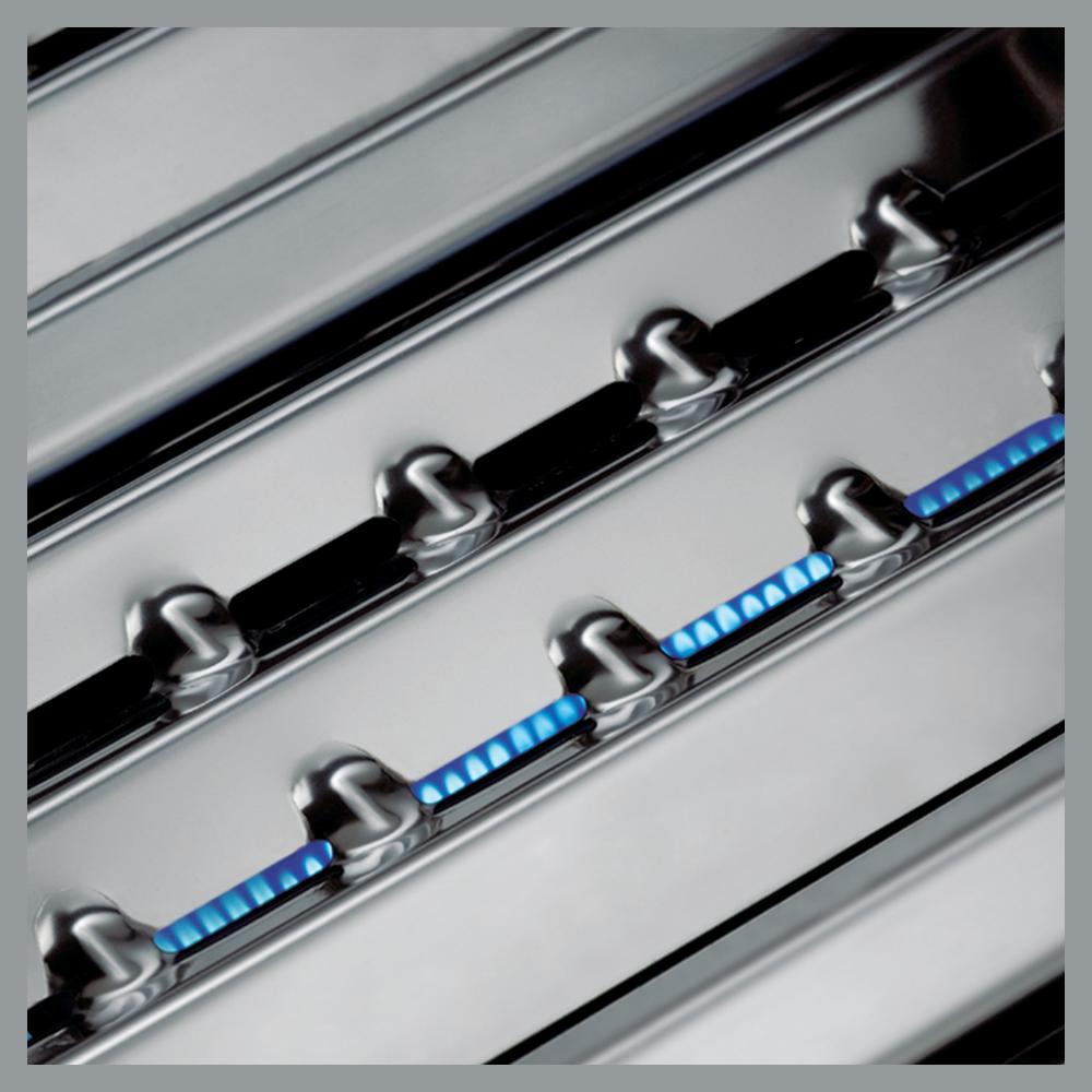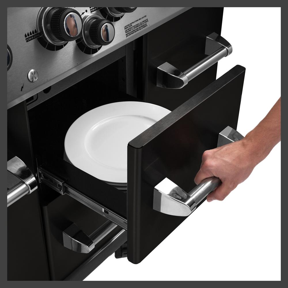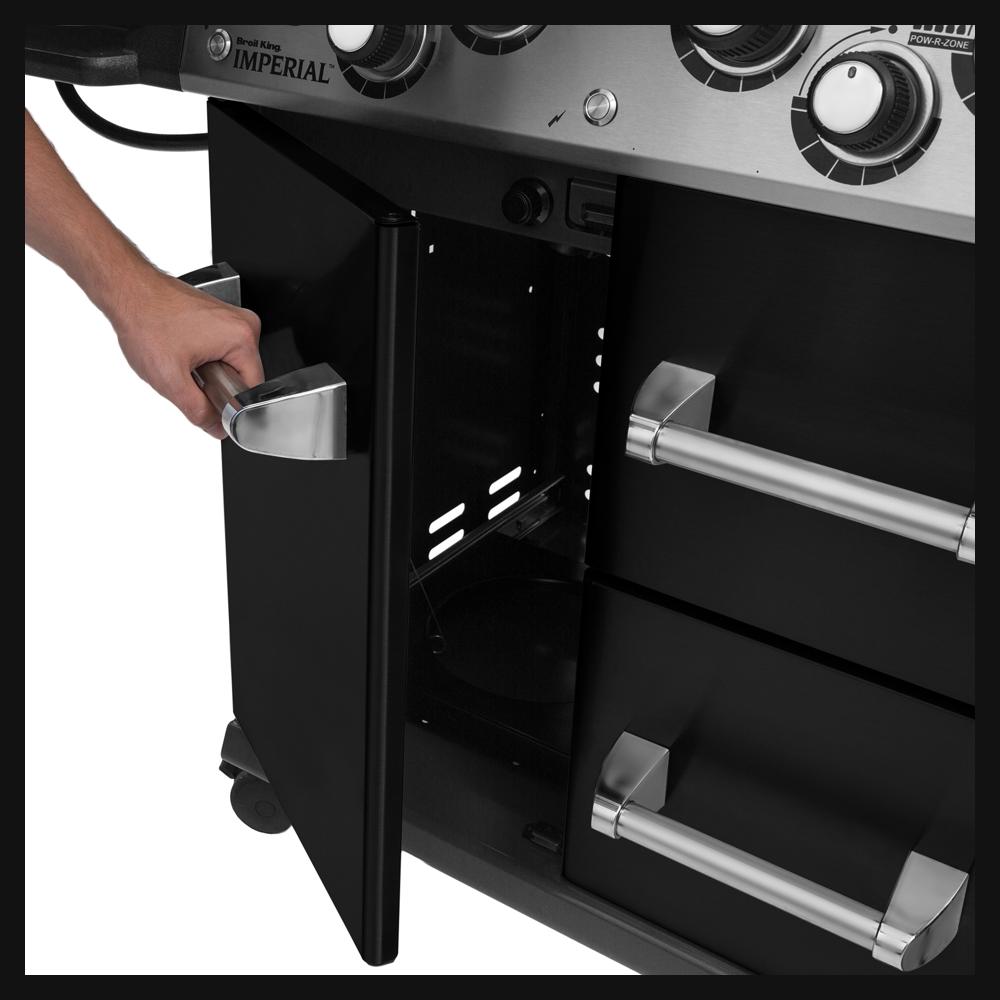 6 Dual Tube Edelstahl Stabbrenner 17,6 kW, Infrarot Seitenbrenner 2,9 kW, Spießbratenbrenner 4,4 kW, 6-tlg. Flav-R-Cast Edelstahlgussroste, Grillfläche 64 x 48,5 cm und 30 x 48,5 cm, Integrierte Grillflächenbeleuchtung, Edelstahl Ablageroste 62 x 21 cm und 26 x 21 cm, Edelstahl Flav-R-Wave Verdampfungssystem, Linear Flow Gasdüsen, Deluxe Accu-temp Thermometer, Sure Lite Elektrozündung,auch am Spießbratenbrenner, Doppelwandige schwarz-emaillierte Deckel mit Aluminiumguss Seitenteilen, Edelstahl-Untergehäuse mit Aluminiumguss Seitenteilen, Edelstahl Deckelgriffe, Edelstahl Bedienteil inkl. Kontrollknopf-Beleuchtung, Edelstahl Seitenablagen mit Zubehörhaken und Frontablagen, Cabinetunterwagen mit Gasflaschenintegration für 11 kg Gasflasche, 2 Türen und 2 integrierte Schubladen mit Edelstahl Griffen, 6 feststellbare Lenkrollen, 3 davon höhenverstellbar, Inkl. Drehspießset und Elektromotor, Inkl. Schlauch und Druckminderer