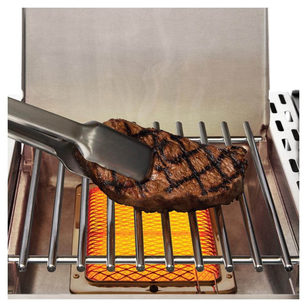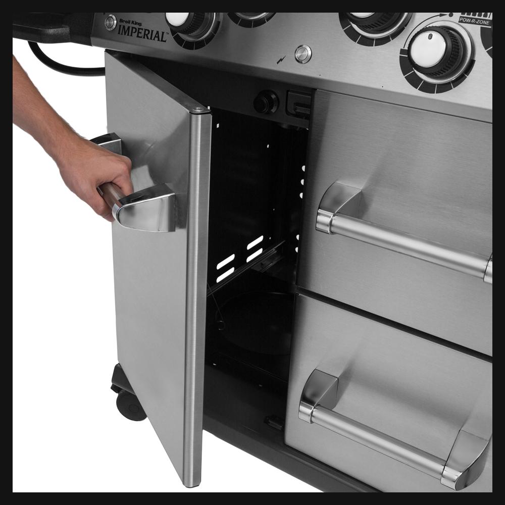 5 Dual Tube Edelstahl Stabbrenner 16,0 kW, Infrarot Seitenbrenner 2,9 kW, Spießbratenbrenner 4,4 kW, 5-tlg. Flav-R-Cast Edelstahlgussroste, Grillfläche 80 x 48,5 cm, Integrierte Grillflächenbeleuchtung, Edelstahl Ablagerost 77 x 21 cm, Edelstahl Flav-R-Wave Verdampfungssystem, Linear Flow Gasdüsen, Deluxe Accu-temp Thermometer, Sure Lite Elektrozündung, auch am Spießbratenbrenner, Doppelwandiger Edelstahl-Deckel mit Aluminiumguss Seitenteilen, Edelstahl-Untergehäuse mit Aluminiumguss Seitenteilen, Edelstahl Deckelgriff, Edelstahl Bedienteil inkl. Kontrollknopf-Beleuchtung, Edelstahl Seitenablagen mit Zubehörhaken und Frontablagen, Cabinetunterwagen mit Gasflaschenintegration für 11 kg Gasflasche, 1 Türe und 2 integrierte Schubladen mit Edelstahl Griffen, 4 feststellbare Lenkrollen, 2 davon höhenverstellbar; Inkl. Drehspießset und Elektromotor, Inkl. Schlauch und Druckminderer