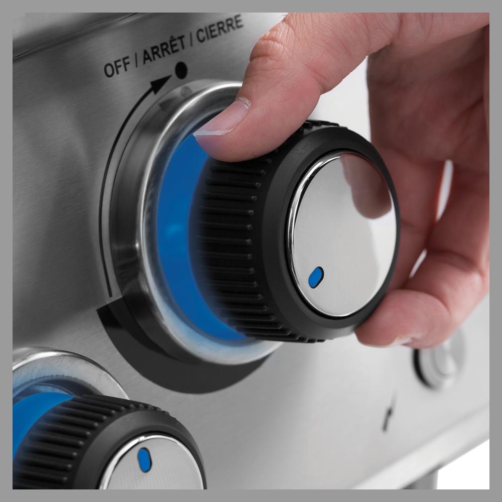 5 Dual Tube Edelstahl Stabbrenner 16 kW, 5-tlg. Flav-R-Cast matt-emaillierte Gussroste, Grillfläche 80 x 48,5 cm, Edelstahl Ablagerost 77 x 21 cm, EdelstahlFlav-R-Wave Verdampfungssystem, Linear Flow Gasdüsen, Deluxe Accu-temp Thermometer, Sure Lite Elektrozündung, Doppelwandiger schwarz-emaillierter Deckel mit Aluminiumguss Seitenteilen, Edelstahl-Untergehäuse mit Aluminiumguss Seitenteilen, Edelstahl Deckelgriff, Edelstahl Bedienteil inkl. Kontrollknopf-Beleuchtung, Inkl. Schlauch und Druckminderer