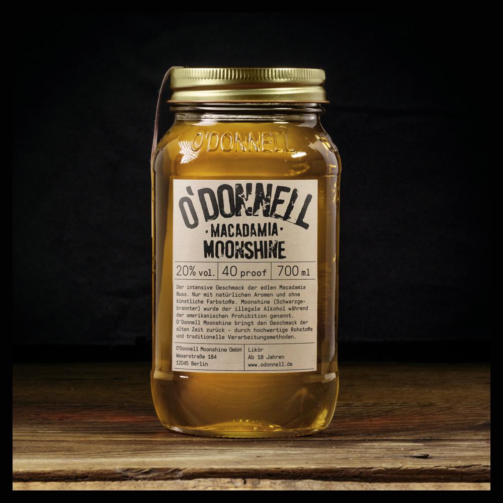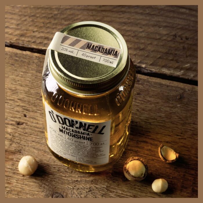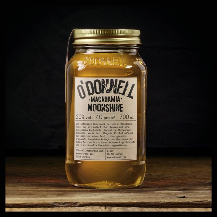 Der exotisch Nussige: Macadamia“ von O’Donnell Moonshine! – zartes Aroma mit angenehmer Süße – mit feinen Noten von Vanille – Likör mit 20% vol. – ohne künstliche Aromen und Farbstoffe Harte Schale, weicher Kern! Diese Beschreibung passt zu keiner anderen Nuss besser, als zur Macadamia. Mit ihrem weichen, buttrigen und leicht süßen Aroma veredelt die Nuss den Moonshine und macht ihn zu einem feinen Geschmackserlebnis. Einer, der immer geht, pur oder als Cocktail. „