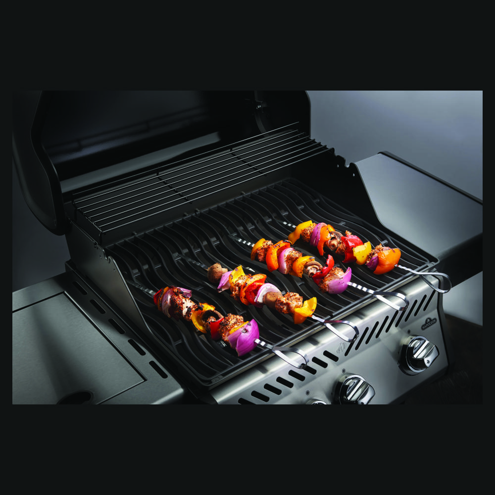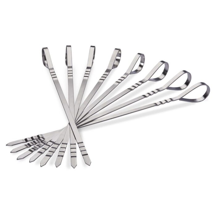 Set von 8 Spießen aus Edelstahl, flach und an beiden Enden eine wellige Form. Die Spieße können für indirektes Grillen im Warmhalterost eingehängt werden, für direktes Grillen können sie auf dem Grillrost platziert werden, spülmaschinenfest, 33,5 cm lang.