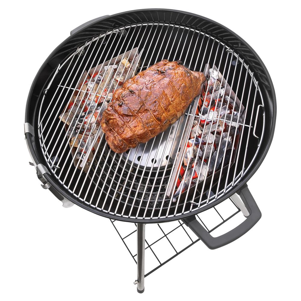 2 Holzkohlekörbe für indirektes Grillen auf einem Napoleon Kugelgrill.