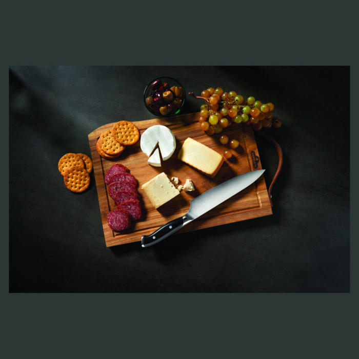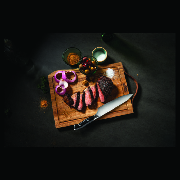 Schneidebrett aus Akazienholz mit Griff aus echtem Leder. Tropfkante für saubere und schnelle Lebensmittelzubereitung und einfache Reinigung. Einschließlich Pro Chefkochmesser.