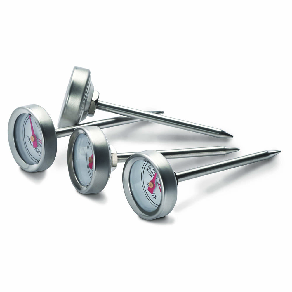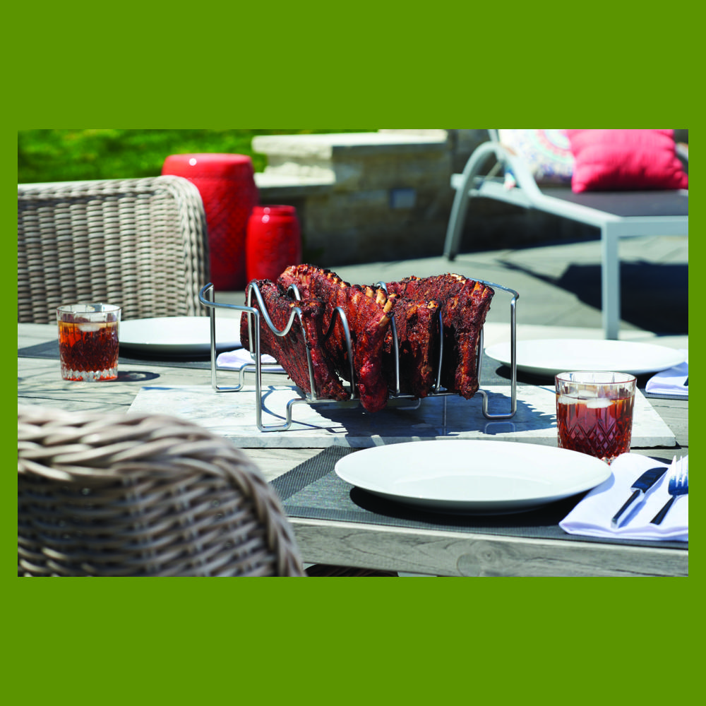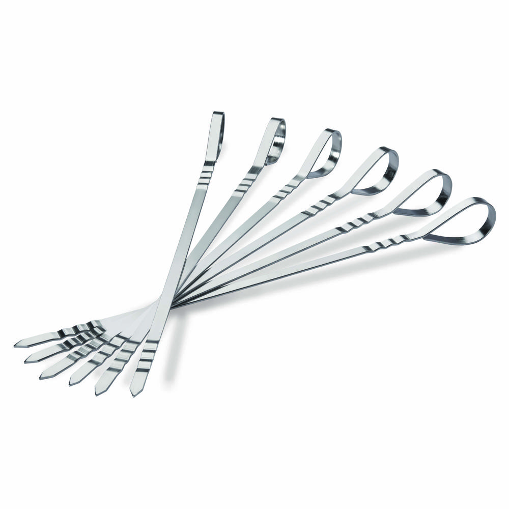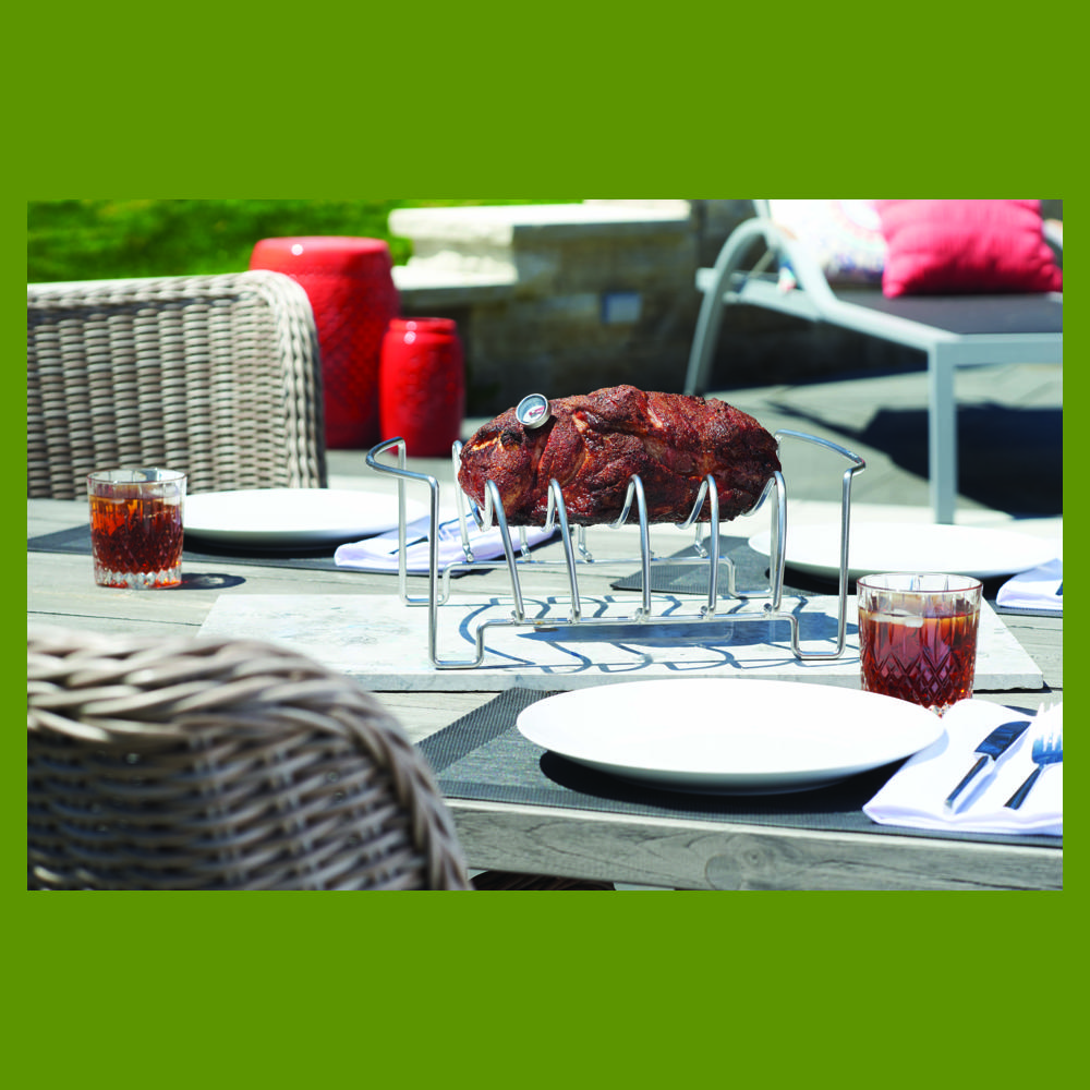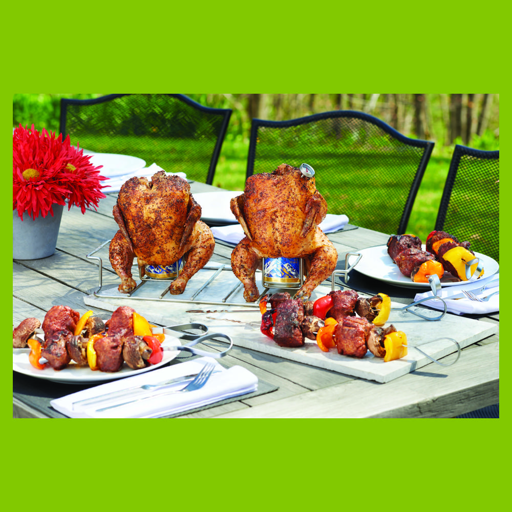 Starter Set Fleisch Liebhaber beinhaltet: 1 Edelstahl Braten- & Ribs- Halter, 1 Edelstahl 2-fach-Bierdosenhähnchen-Halter, 6 Edelstahl Spieße (33,5 cm lang), 4 Stück Taschenthermometer Display zur Warenpräsentation
